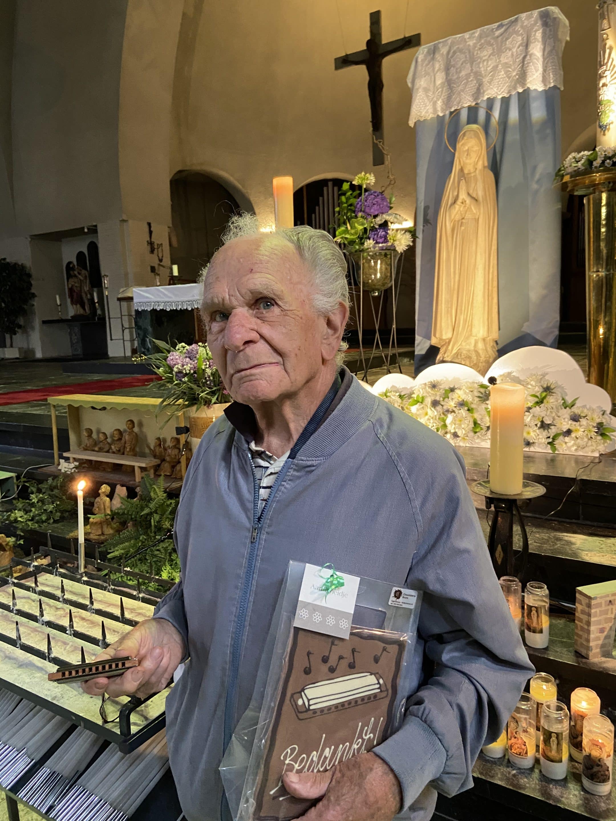 “Op de zolder staan nog altijd mijn drie accordeons. Helaas werkeloos, want mijn vingers doen het niet meer. Te hard en te lang gewerkt, 43 jaar in de metaal als bankwerker. Twaalf jaar was ik toen ik mij eerste accordeon kon kopen. Ik had het gespaard door bij de buren werkjes op te knappen. Het spelen heb ik mezelf geleerd. In de meimaand speelde ik wel eens bij het kapelletje op de Bossen, natuurlijk Marialiedjes.”